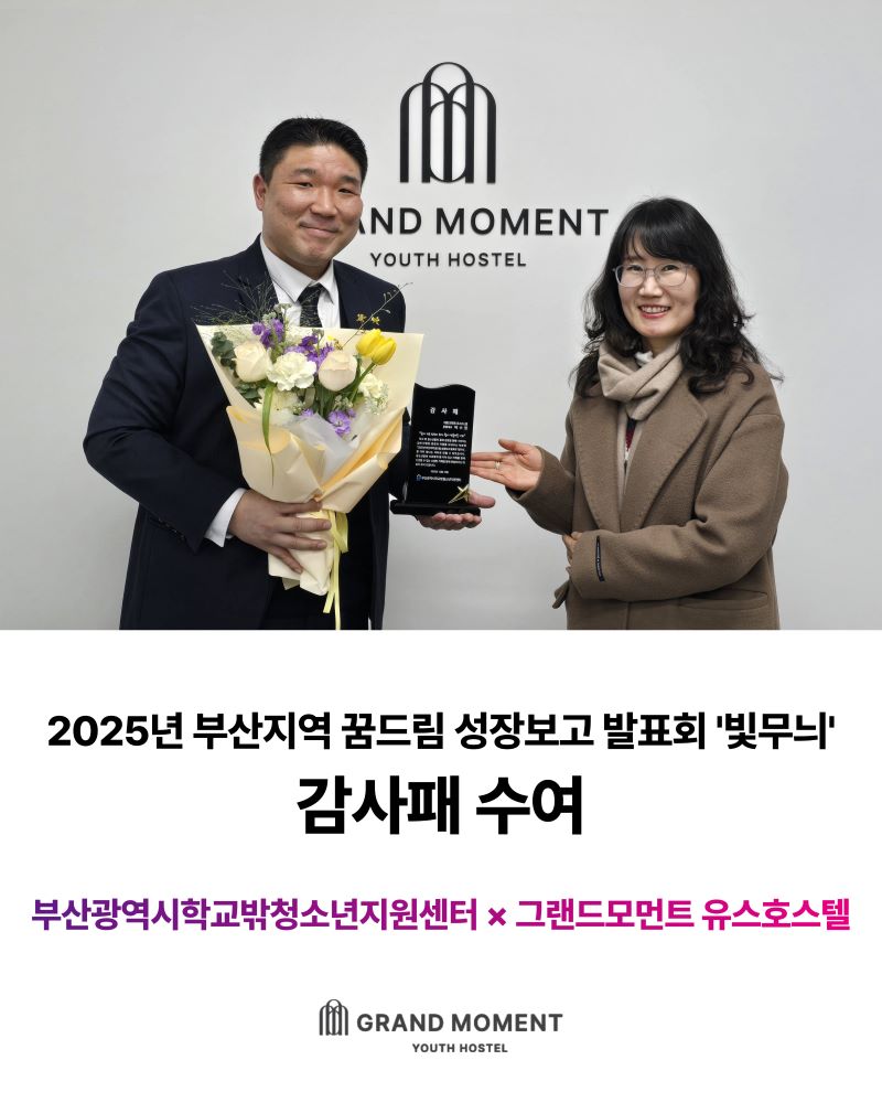 [그랜드모먼트 유스호스텔 감사패 수여]■ 2025 부산지역 꿈드림 성장보고 발표회 '빛무늬' 운영 지원 및 후원■ 학교 밖 청소년 성장 지원 감사패 수여저희 그랜드모먼트 유스호스텔은 학교 밖 청소년들이 자신의 꿈과 가능성을 펼칠 수 있도록,