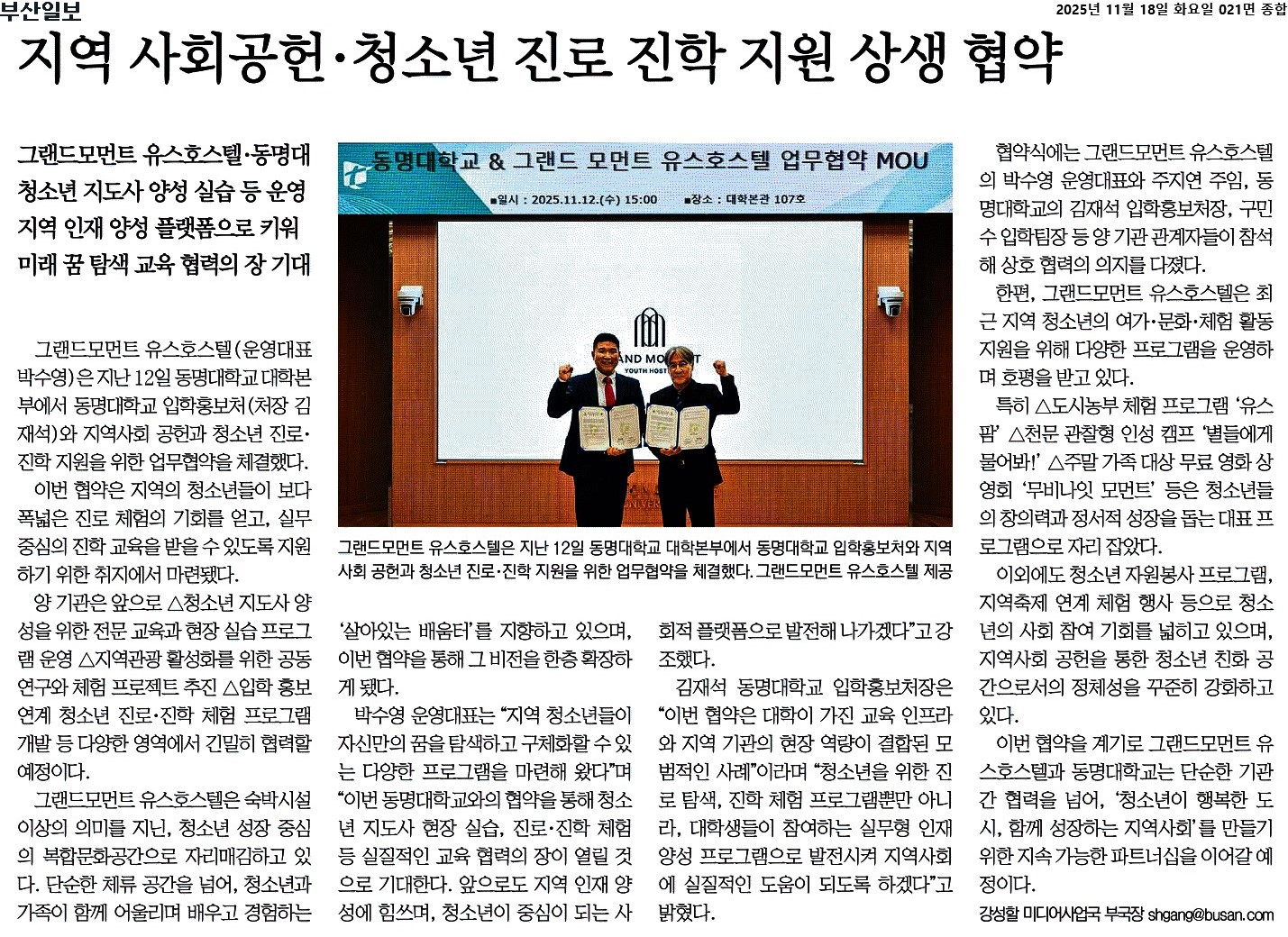 2025년 11월 18일자 [부산일보] 지역 사회공헌 청소년 진로 진학 지원 상생 협약 출처 : https://www.busan.com/view/busan/view.php?code=2025111413571990151