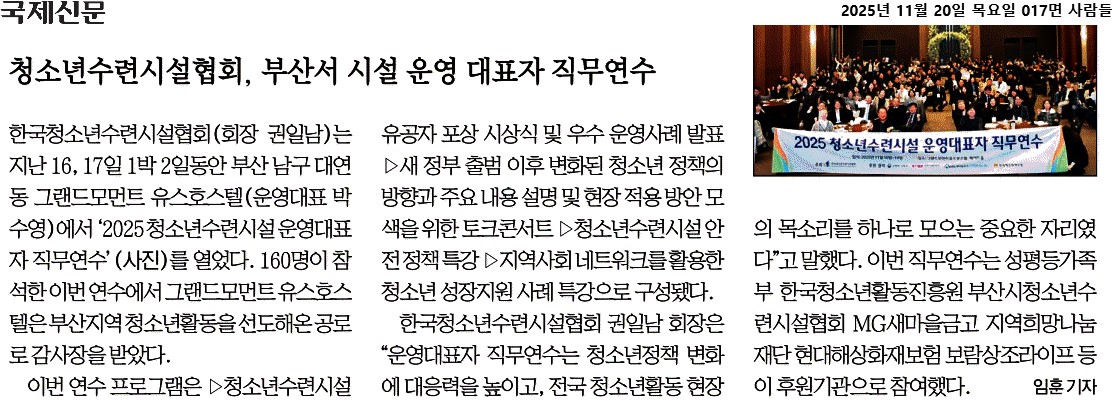 2025년 11월 20일자 [국제신문] 청소년수련시설협회, 부산서 시설 운영 대표자 직무연수