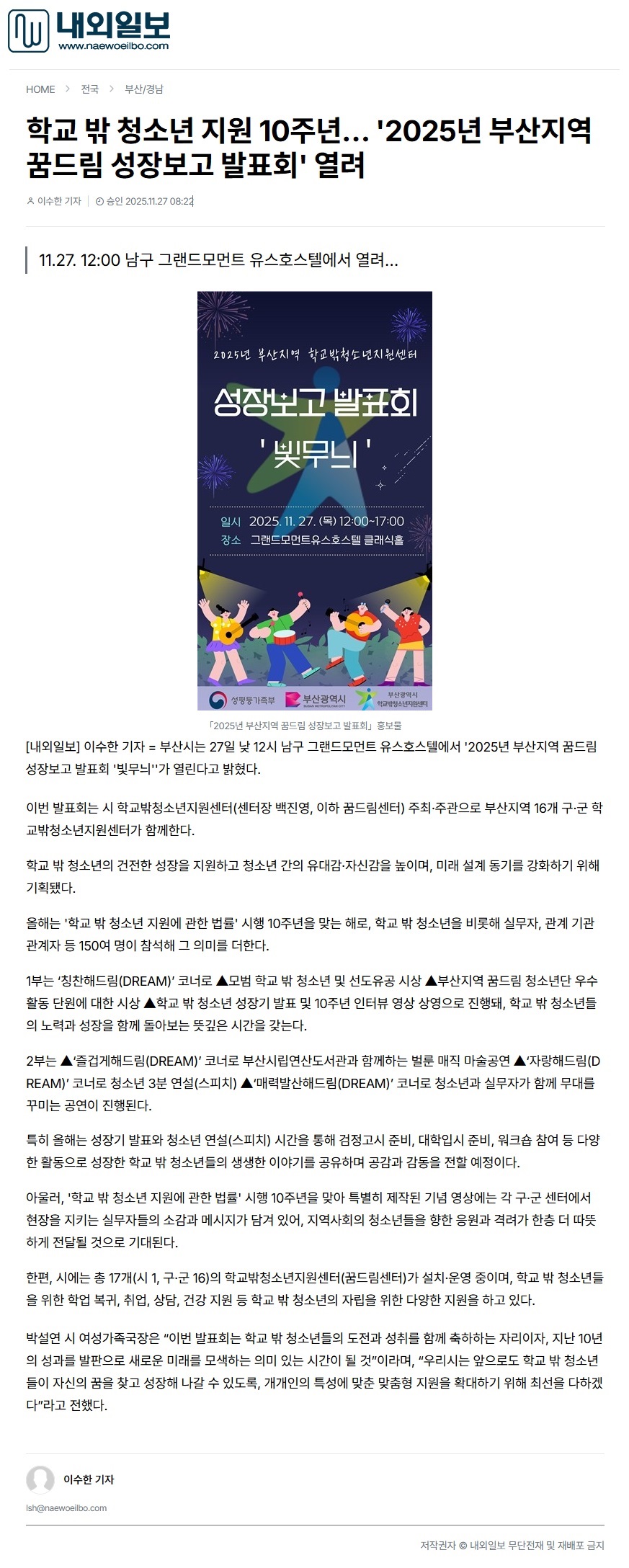 2025년 11월 27일자 [내외일보] 학교 밖 청소년 지원 10주년… '2025년 부산지역 꿈드림 성장보고 발표회' 열려 출처 : https://www.naewoeilbo.com/news/articleView.html?idxno=2251787#google_vignette