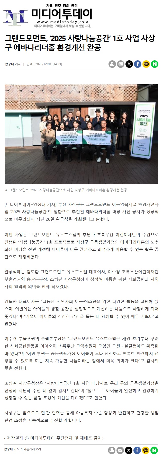 2025년 12월 01일자 [미디어투데이] 그랜드모먼트, ‘2025 사랑나눔공간’ 1호 사업 사상구 에바다리더홈 환경개선 완공 출처 : https://www.mediatoday.asia/1581108