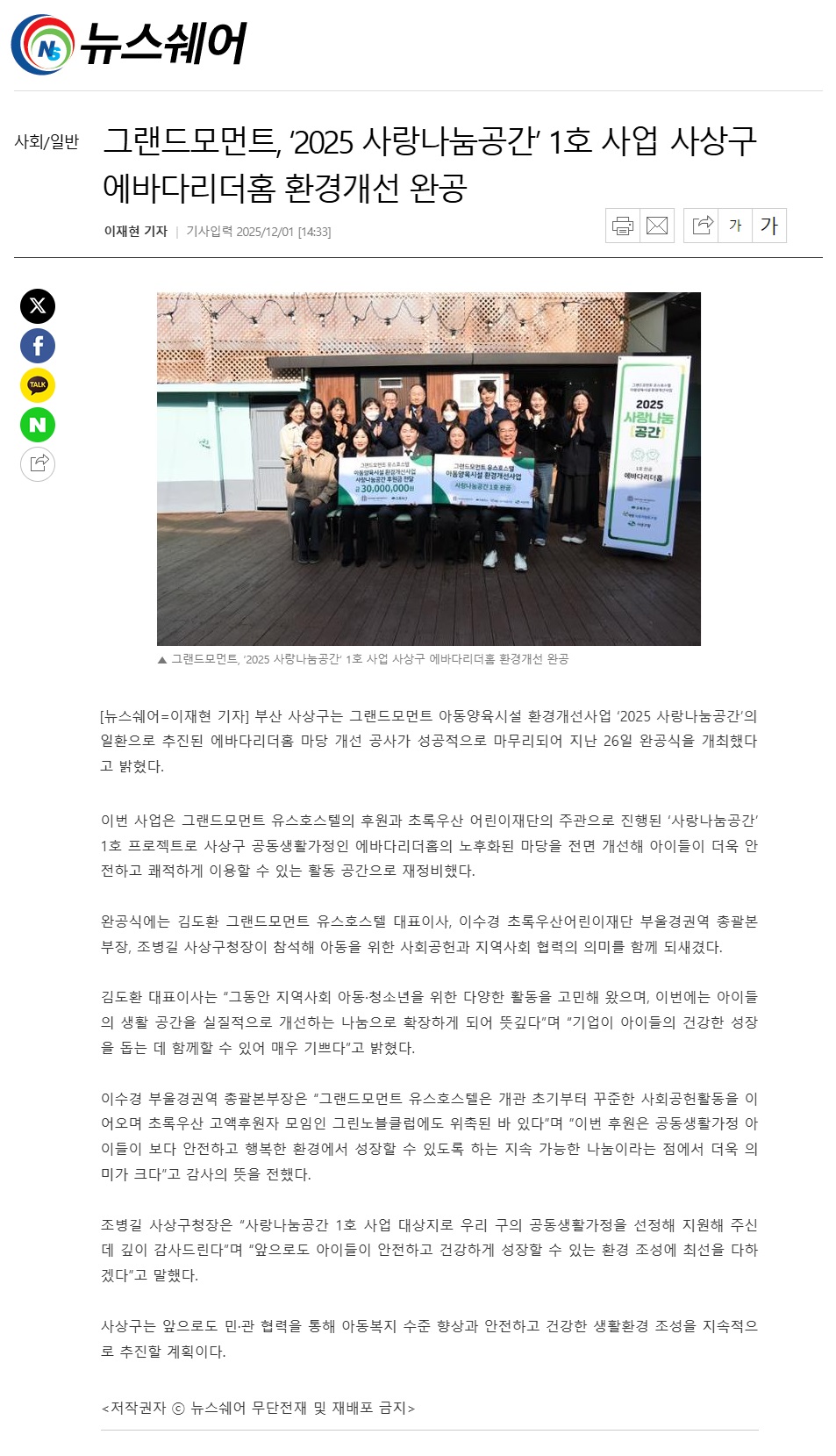 2025년 12월 01일자 [뉴스쉐어] 그랜드모먼트, ‘2025 사랑나눔공간’ 1호 사업 사상구 에바다리더홈 환경개선 완공 출처 : https://www.newsshare.co.kr/sub_read.html?uid=1668624