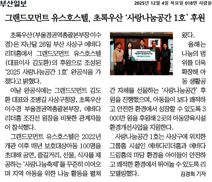 2025년 12월 04일자 [부산일보] 그랜드모먼트 유스호스텔, 초록우산 사랑나눔공간 1호 후원