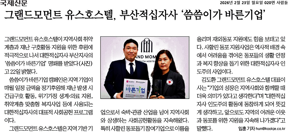 2026년 02월 23일자 [국제신문] 그랜드모먼트 유스호스텔, 부산적십자사 '씀씀이가 바른기업'
