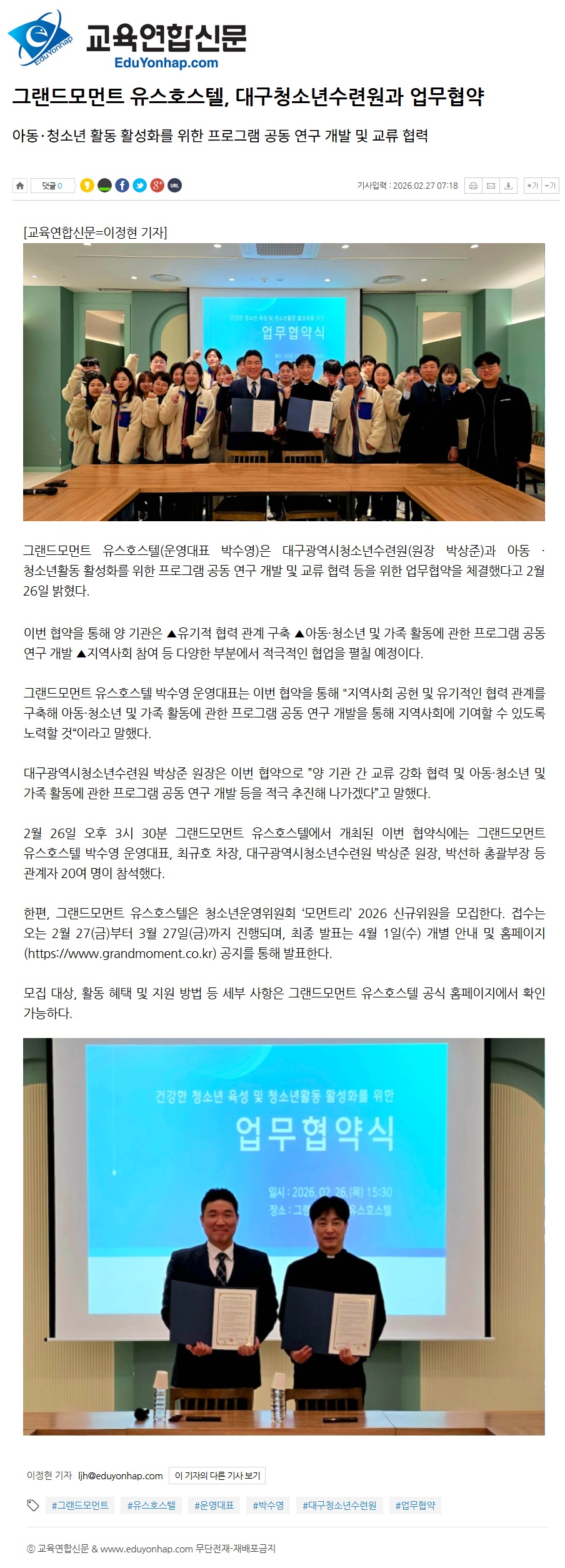 2026년 02월 27일자 [교육연합신문] 그랜드모먼트 유스호스텔, 대구청소년수련원과 업무협약