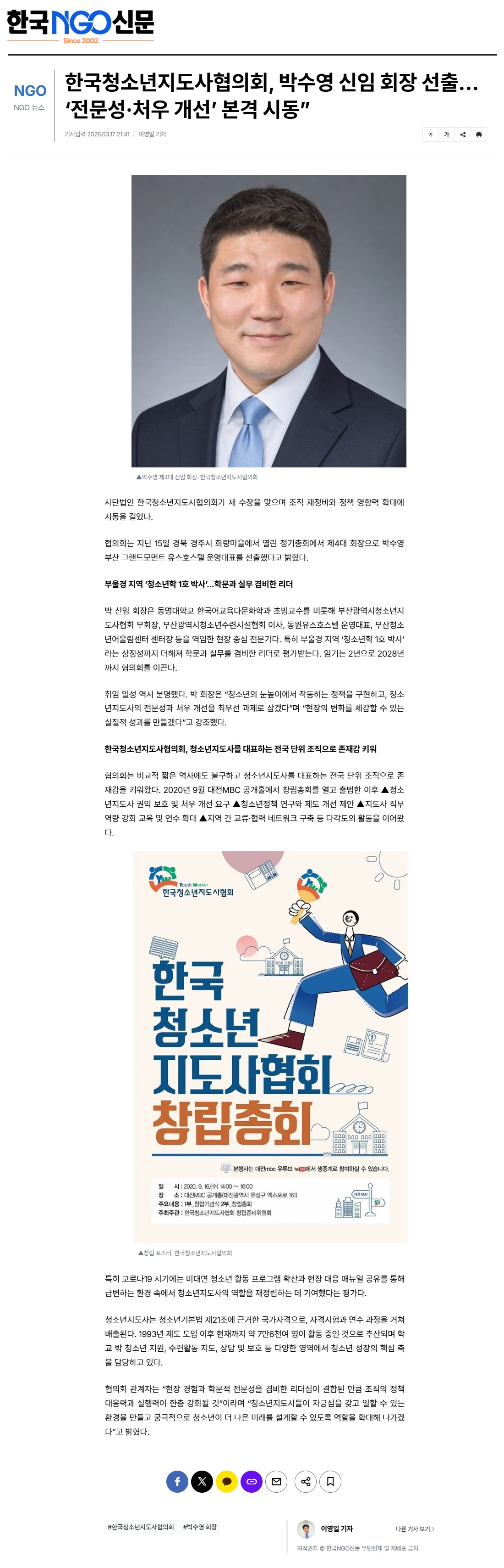 2026년 03월 17일자 [한국NGO신문] 한국청소년지도사협의회, 박수영 신임 회장 선출…‘전문성·처우 개선’ 본격 시동” 출처 : https://www.ngonews.kr/news/articleView.html?idxno=226416