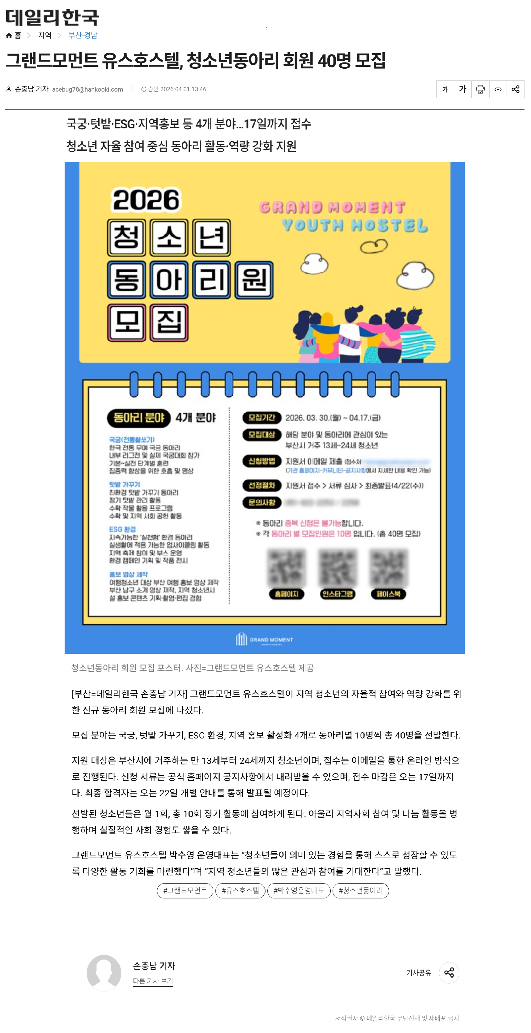 2026년 4월 1일자 [데일리한국] 그랜드모먼트 유스호스텔, 청소년동아리 회원 40명 모집 출처 : https://daily.hankooki.com/news/articleView.html?idxno=1354007
