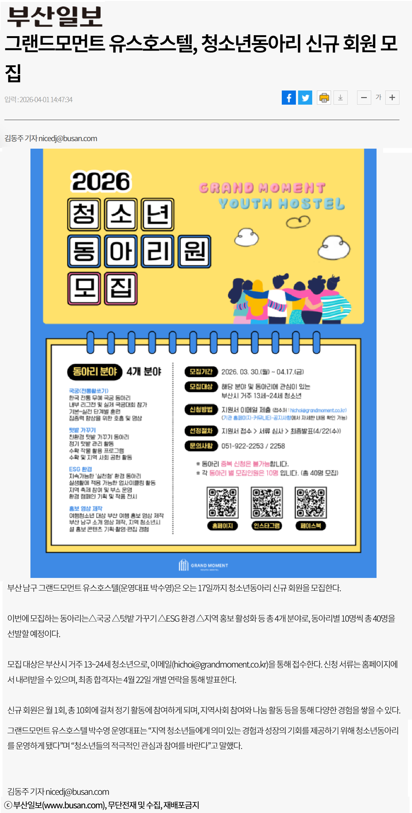 2026년 4월 1일자 [부산일보] 그랜드모먼트 유스호스텔, 청소년동아리 신규 회원 모집 출처 : https://www.busan.com/view/busan/view.php?code=2026040110104318812