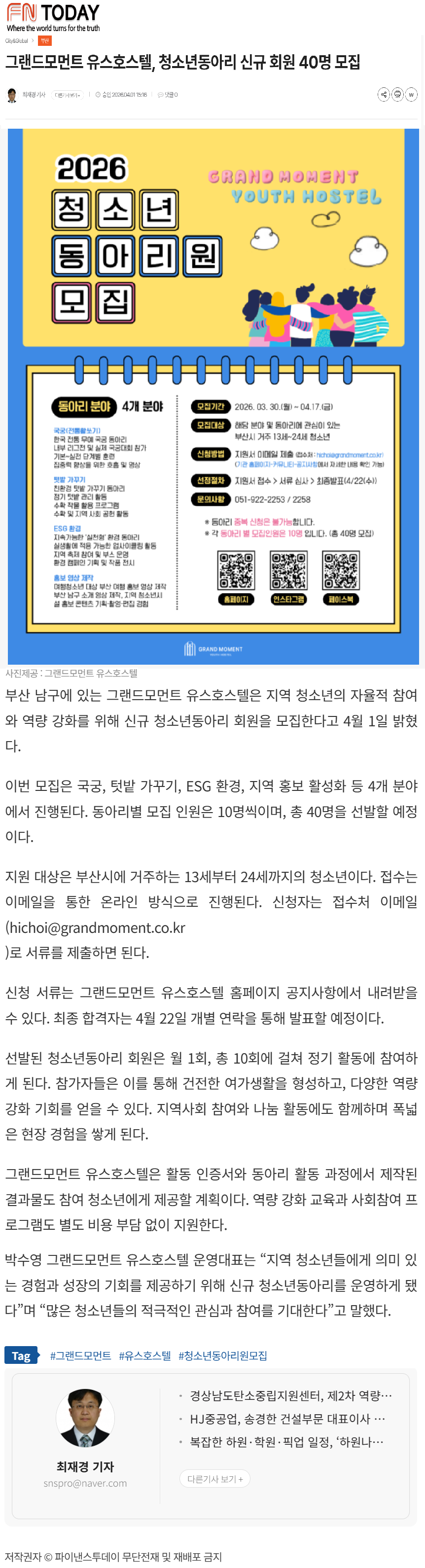2026년 4월 1일자 [FNTODAY] 그랜드모먼트 유스호스텔, 청소년동아리 신규 회원 40명 모집