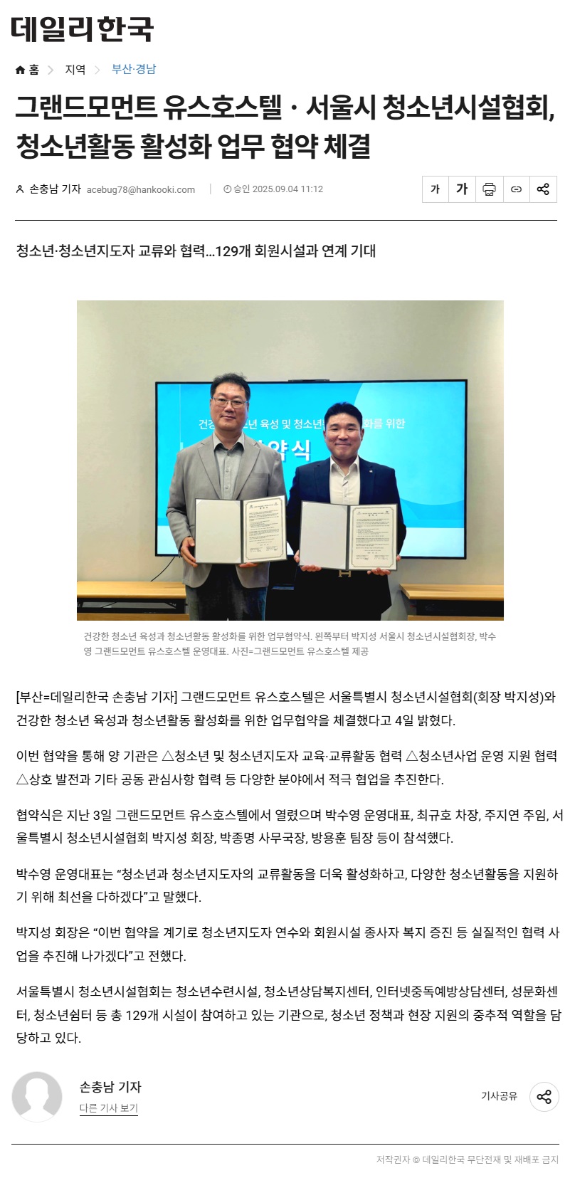 2025년 09월 04일자 [데일리한국] 그랜드모먼트 유스호스텔ㆍ서울시 청소년시설협회, 청소년활동 활성화 업무협약 체결 출처 : https://daily.hankooki.com/news/articleView.html?idxno=1266514