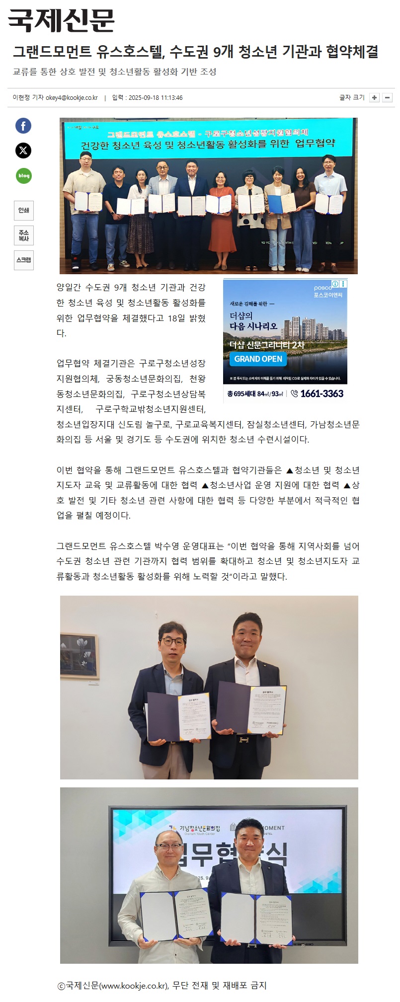 2025년 09월18일자 [국제신문] 그랜드모먼트 유스호스텔, 수도권 9개 청소년 기관과 협약체결