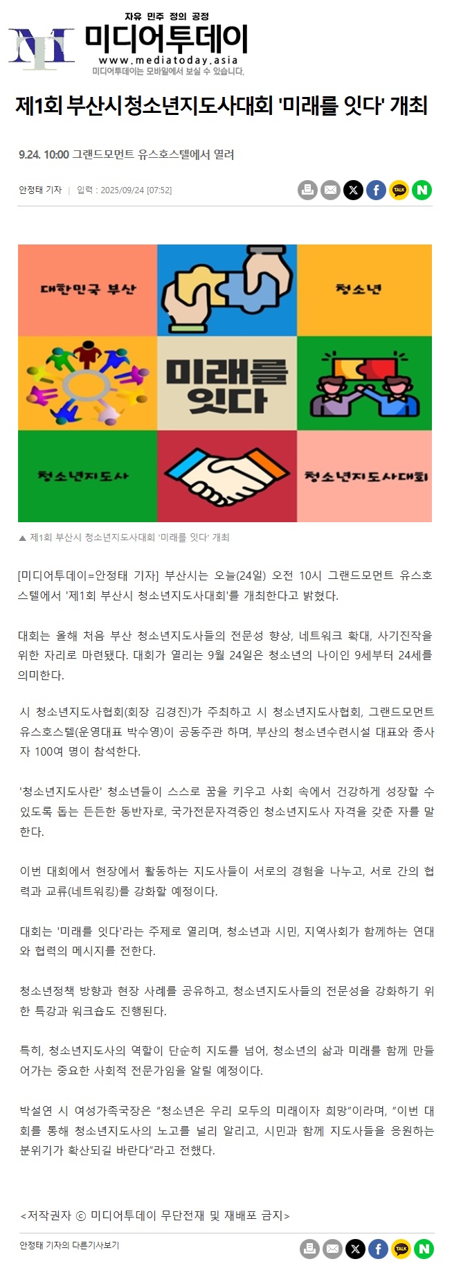 2025년 09월 24일자 [미디어투데이] 제1회 부산시 청소년지도사대회 '미래를 잇다' 개최
