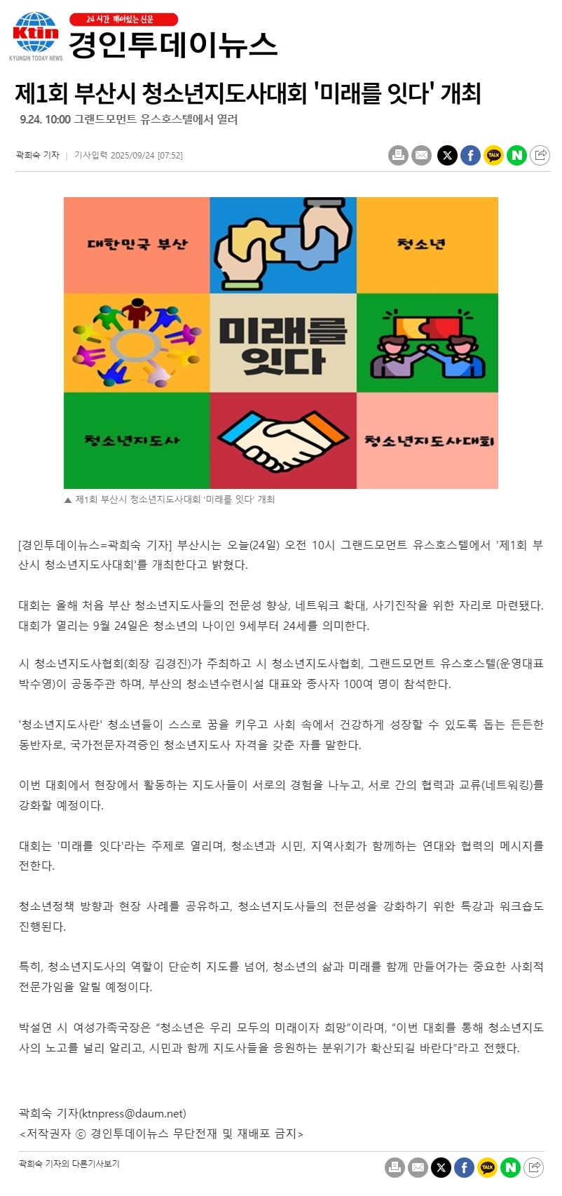 2025년 09월 24일자 [경인투데이뉴스] 제1회 부산시 청소년지도사대회 '미래를 잇다' 개최