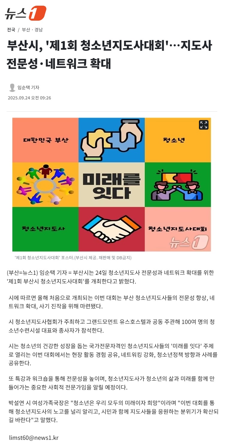 2025년 09월 24일자 [뉴스1] 부산시, '제1회 청소년지도사대회'…지도사 전문성·네트워크 확대 출처 : https://www.news1.kr/local/busan-gyeongnam/5922943