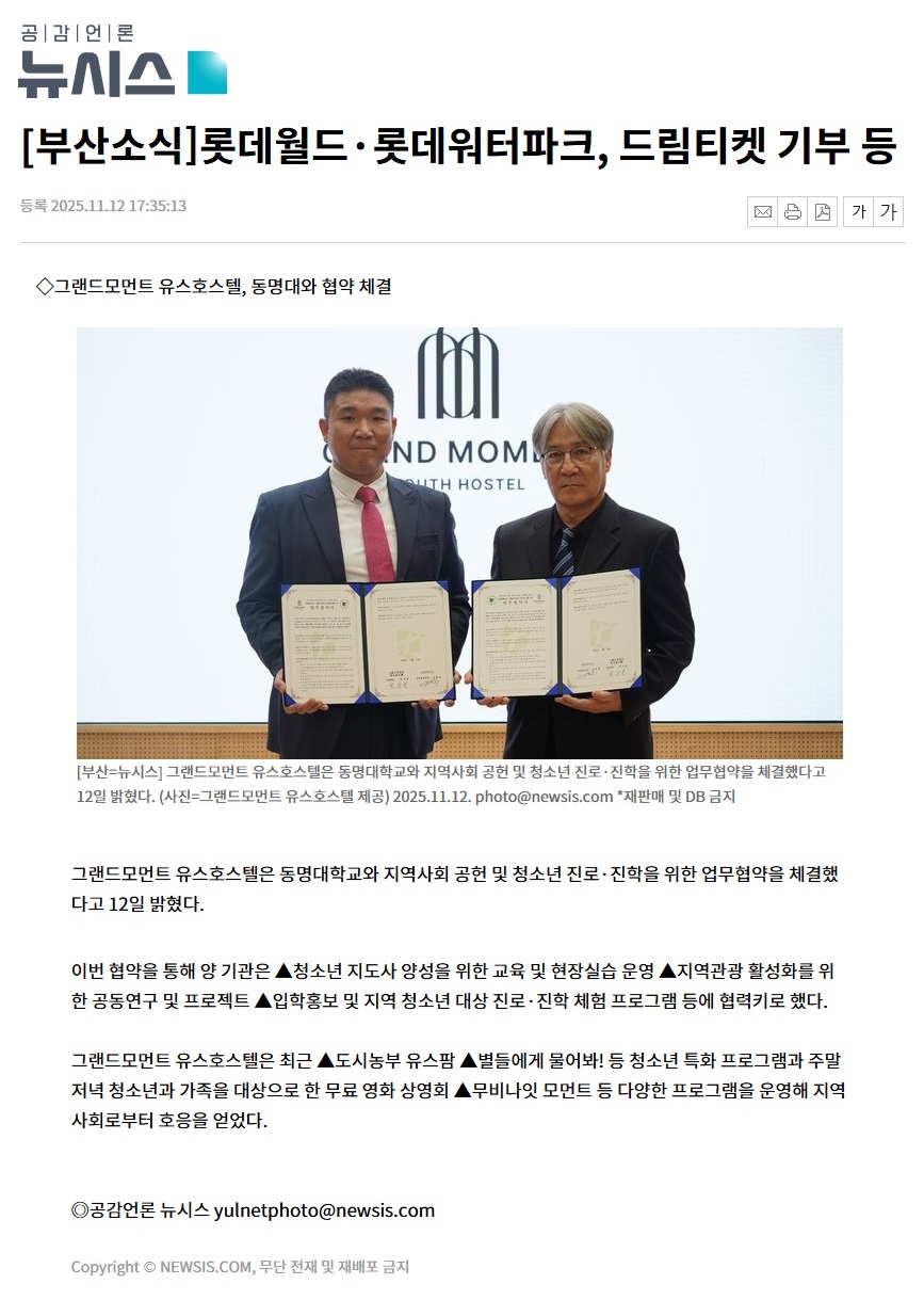 2025년 11월 12일자 [뉴시스] 그랜드모먼트 유스호스텔, 동명대와 협약 체결 출처 : https://www.newsis.com/view/NISX20251112_0003400491