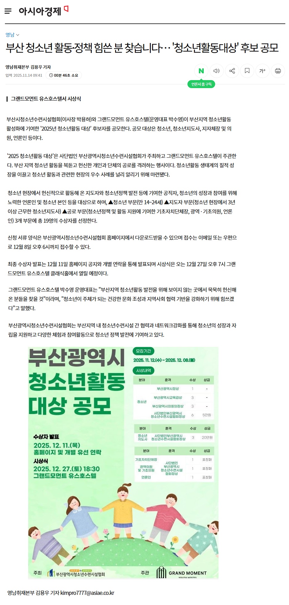 2025년 11월 14일자 [아시아경제] 부산 청소년 활동·정책 힘쓴 분 찾습니다… '청소년활동대상' 후보 공모
