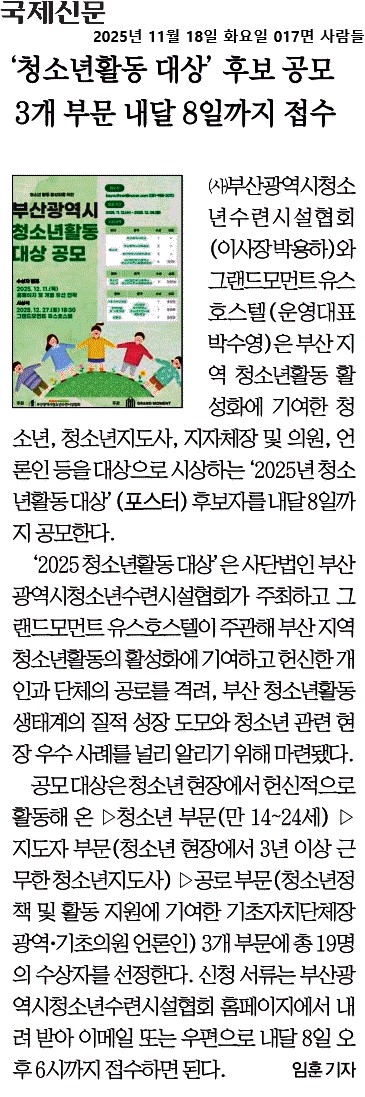 2025년 11월 18일자 [국제신문] 청소년활동 대상 후보 공모 3개 부문 내달 8일까지 접수 출처 : https://www.kookje.co.kr/news2011/asp/newsbody.asp?code=2100&key=20251118.22017005521