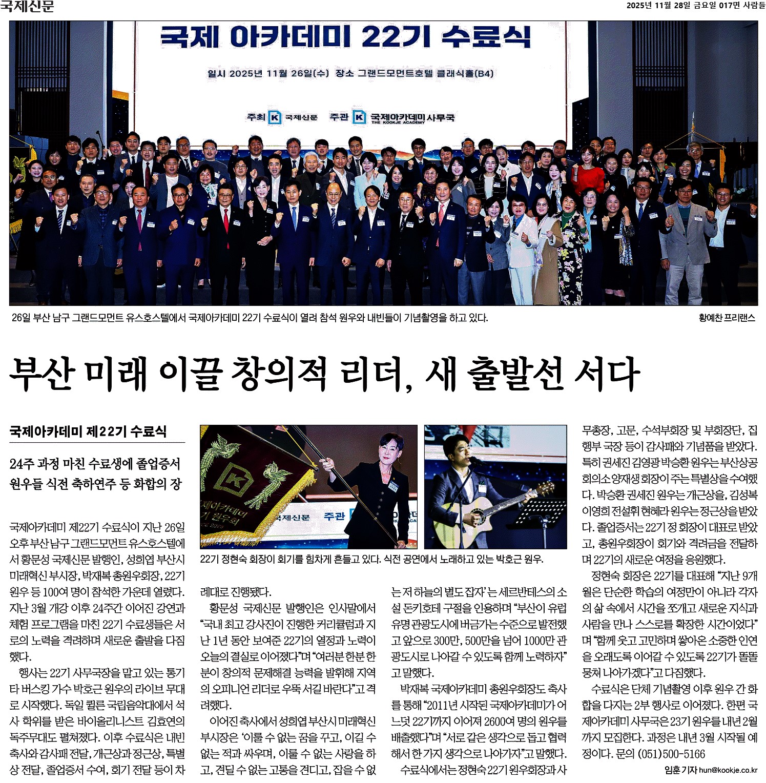 2025년 11월 28일자 [국제신문] 부산 미래 이끌 창의적 리더, 새 출발선 서다 출처 : https://www.kookje.co.kr/news2011/asp/newsbody.asp?code=2100&key=20251128.22017009121