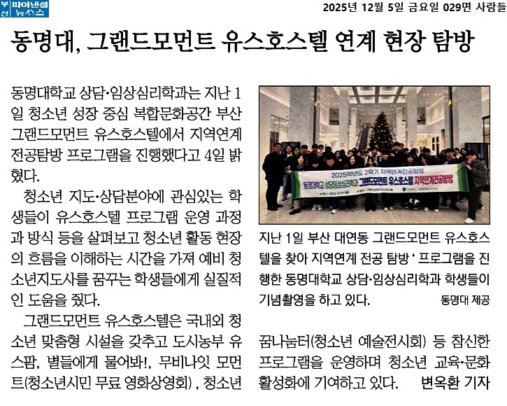 2025년 12월 05일자 [부산파이낸셜뉴스] 동명대, 그랜드모먼트 유스호스텔 연계 현장 탐방 출처 : https://n.news.naver.com/article/014/0005444122?sid=102