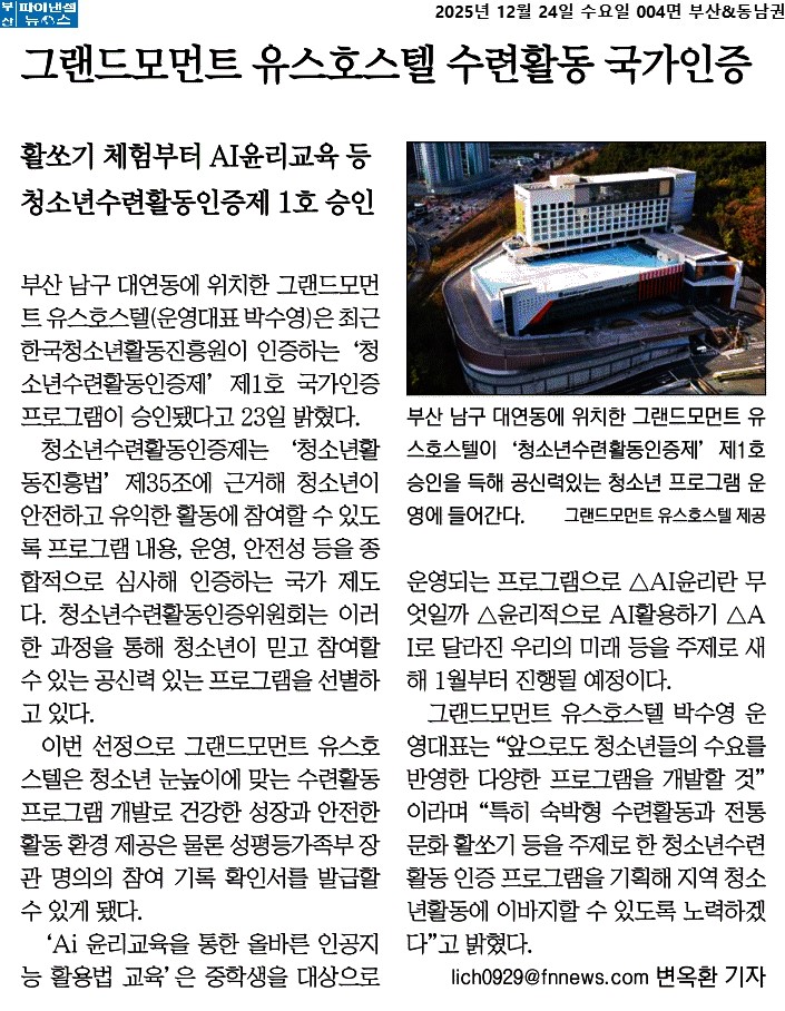2025년 12월 24일자 [부산파이낸셜뉴스] 그랜드모먼트 유스호스텔 수련활동 국가인증