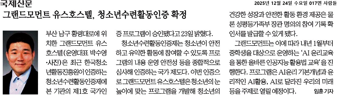 2025년 12월 24일자 [국제신문] 그랜드모먼트 유스호스텔, 청소년수련활동인증 확정 출처 : https://www.kookje.co.kr/news2011/asp/newsbody.asp?code=2100&key=20251224.22017008581
