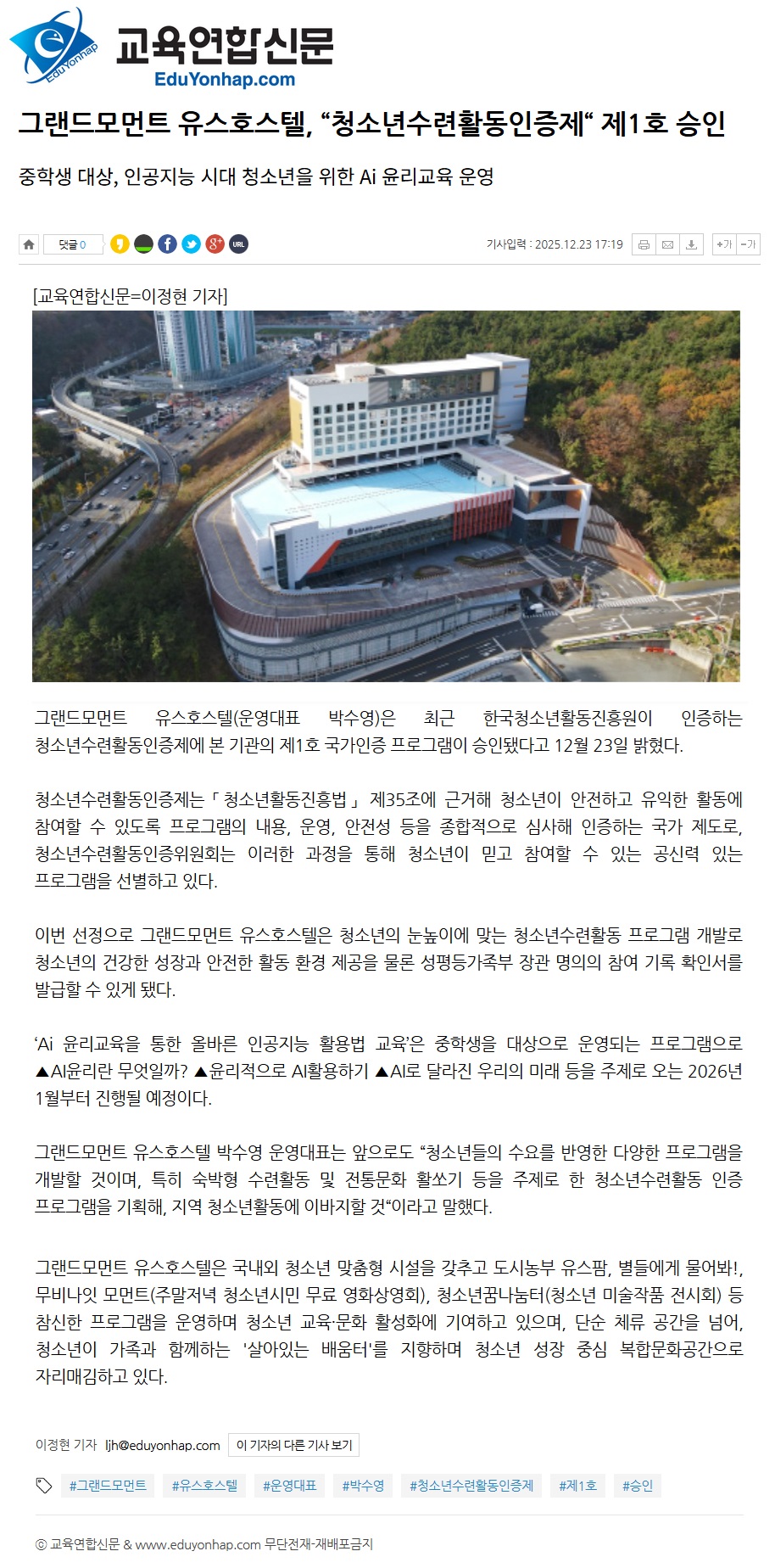 2025년 12월 23일자 [교육연합신문] 그랜드모먼트 유스호스텔, 청소년수련활동인증제 제1호 승인 출처 : https://www.eduyonhap.com/news/view.php?no=97813