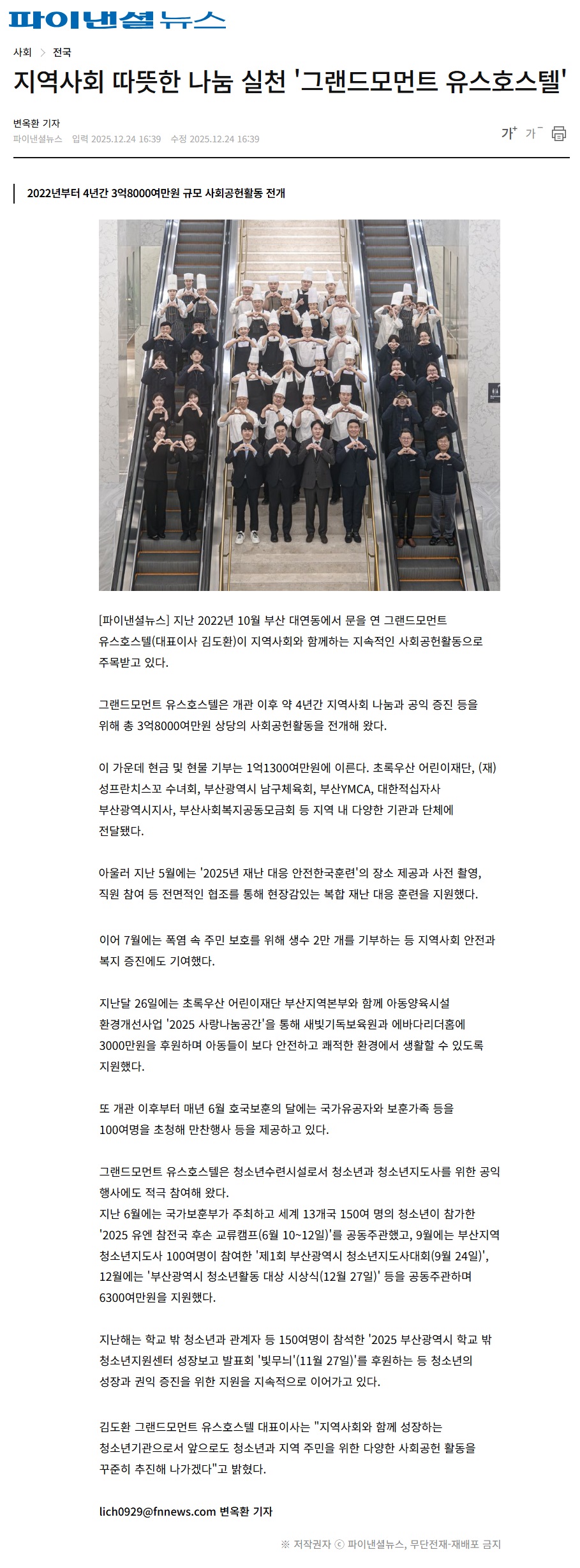 2025년 12월 24일자 [파이낸셜뉴스] 지역사회 따뜻한 나눔 실천 '그랜드모먼트 유스호스텔'