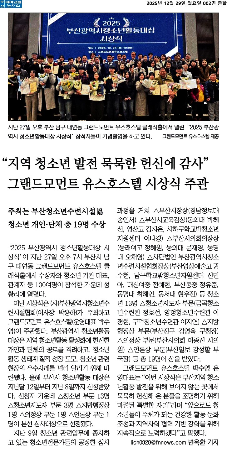 2025년 12월 29일자 [부산파이낸셜뉴스] 지역 청소년 발전 묵묵한 헌신에 감사 그랜드모먼트 유스호스텔 시상식 주관