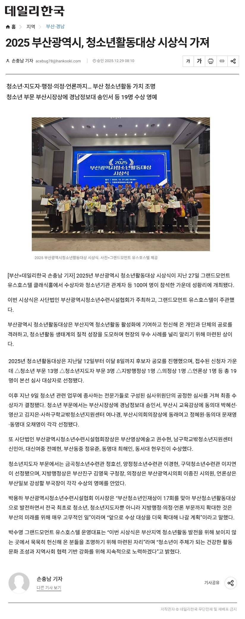 2025년 12월 29일자 [데일리한국] 2025 부산광역시, 청소년활동대상 시상식 가져