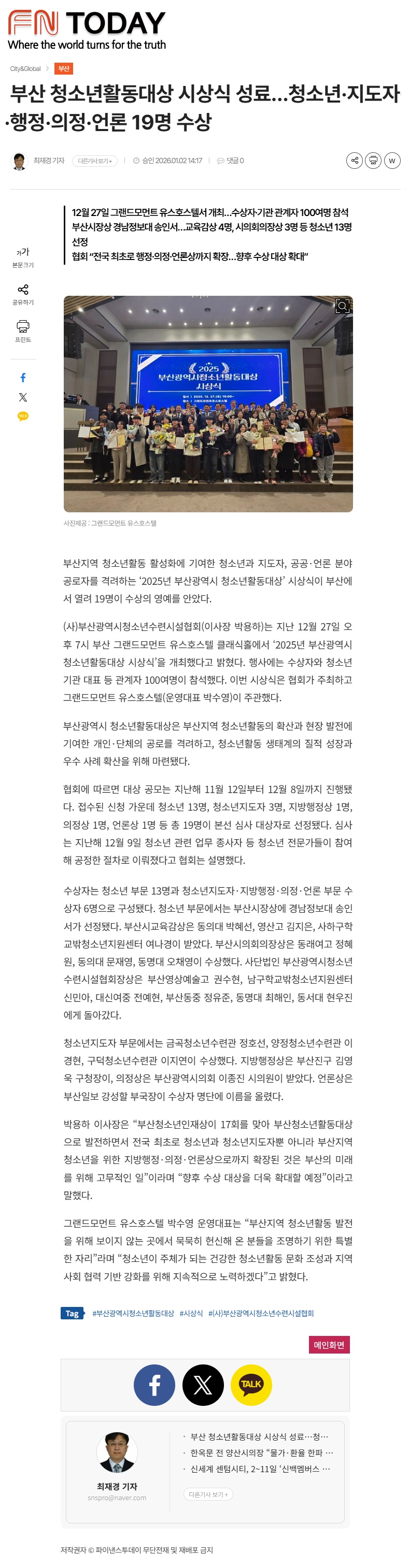 2026년 01월 02일자 [파이낸스투데이] 부산 청소년활동대상 시상식 성료…청소년·지도자·행정·의정·언론 19명 수상