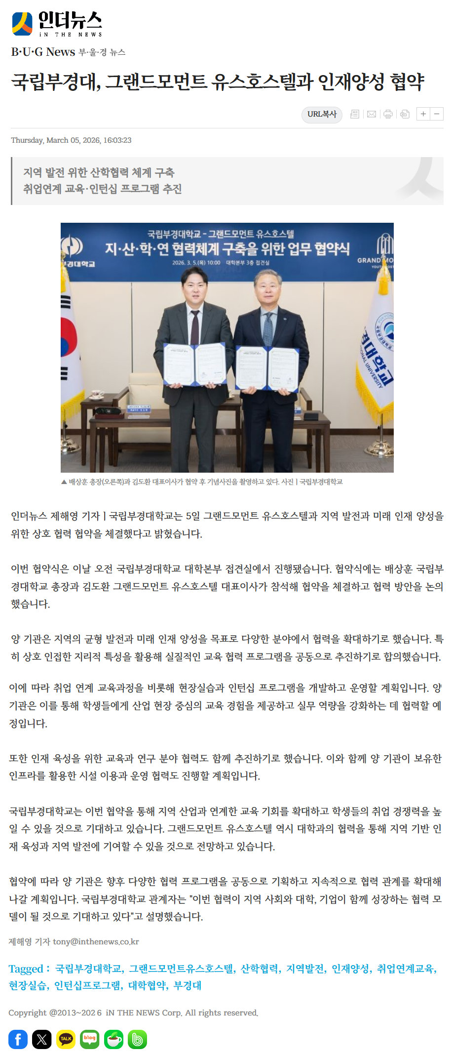 2026년 3월 5일자 [인더뉴스] 국립부경대, 그랜드모먼트 유스호스텔과 인재양성 협약 출처 : https://www.inthenews.co.kr/news/article.html?no=83850