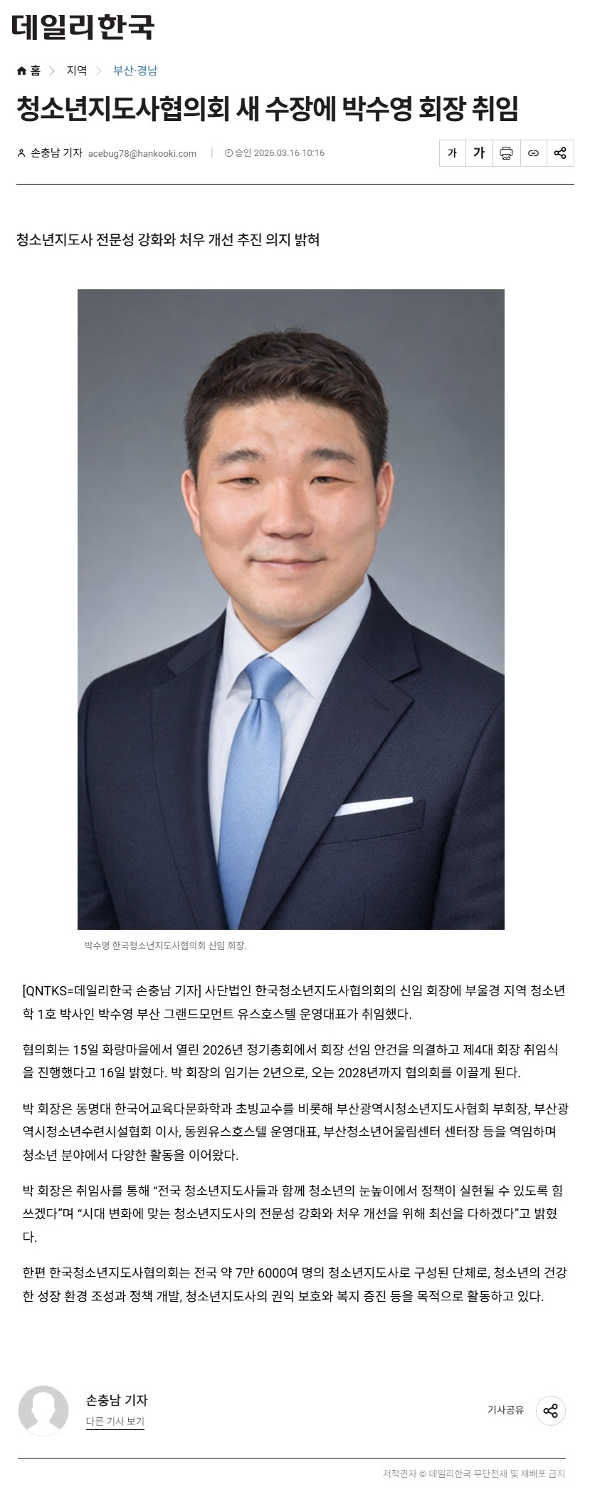 2026년 03월 16일자 [데일리한국] 청소년지도사협의회 새 수장에 박수영 회장 취임 출처 : https://daily.hankooki.com/news/articleView.html?idxno=1347193