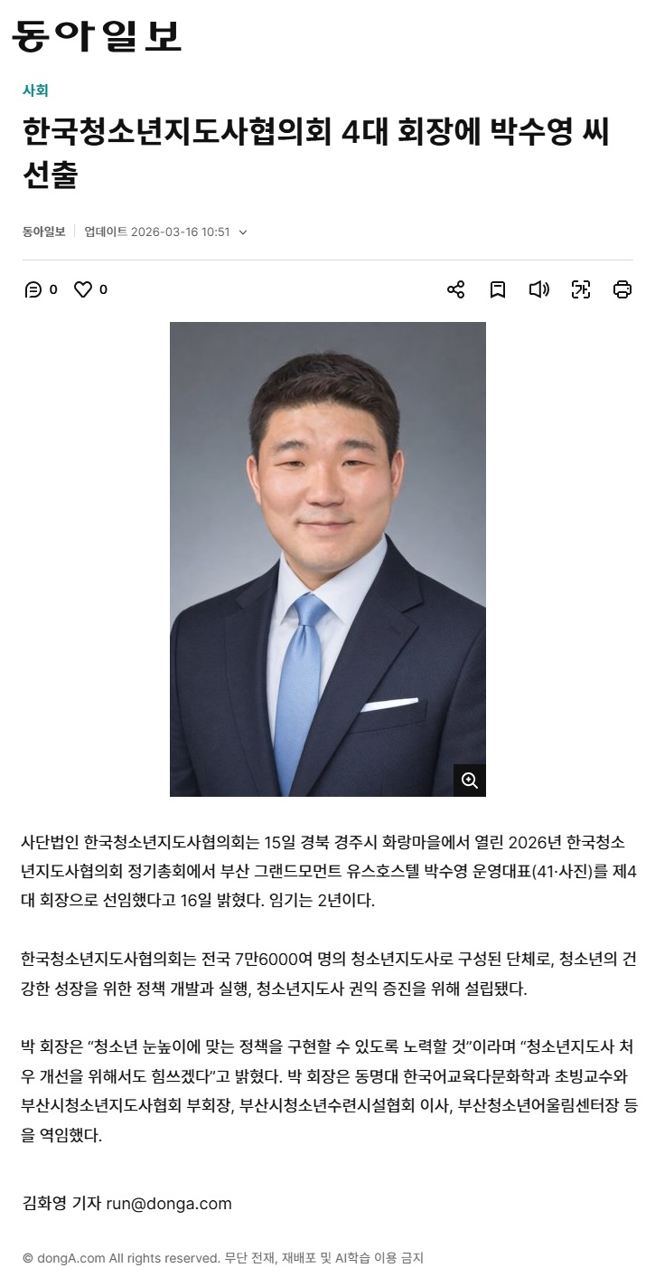2026년 03월 16일자 [동아일보] 한국청소년지도사협의회 4대 회장에 박수영 씨 선출 출처 : https://www.donga.com/news/Society/article/all/20260316/133536624/1
