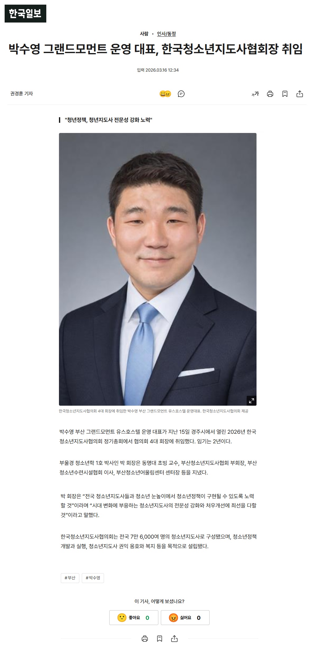 2026년 03월 16일자 [한국일보] 박수영 그랜드모먼트 운영 대표, 한국청소년지도사협회장 취임 출처 : https://www.hankookilbo.com/news/article/A2026031609260000833?did=NA