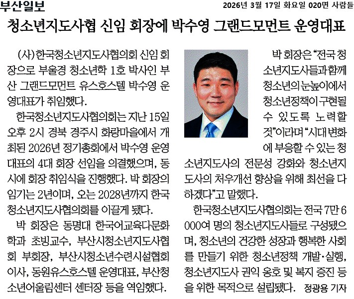 2026년 03월 17일자 [부산일보] 청소년지도사협 신임 회장에 박수영 그랜드모먼트 운영대표