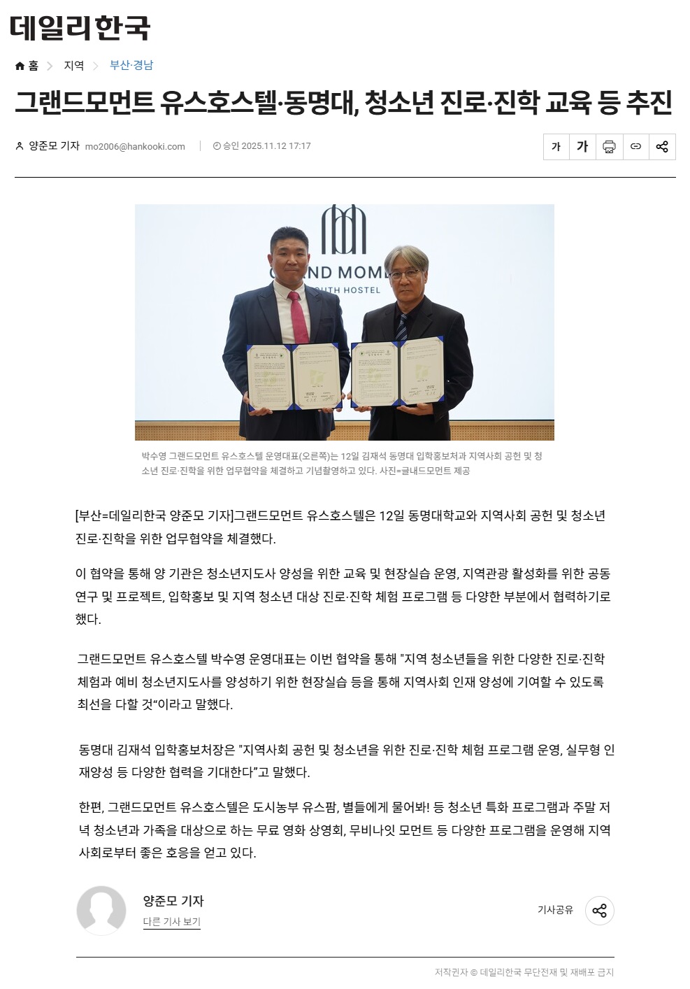 2025년11월 12일자 [데일리한국] 그랜드모먼트 유스호스텔·동명대, 청소년 진로·진학 교육 등 추진 출처 : https://daily.hankooki.com/news/articleView.html?idxno=1295404