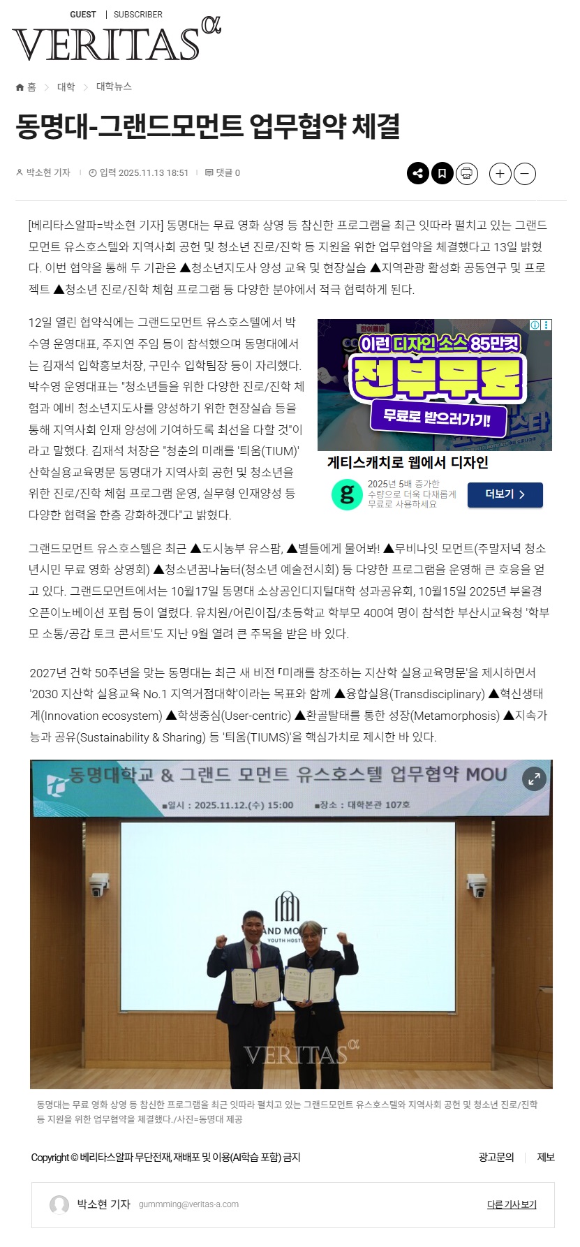 2025년 11월 13일자 [베리타스알파] 동명대-그랜드모먼트 업무협약 체결 출처 : https://www.veritas-a.com/news/articleView.html?idxno=582727