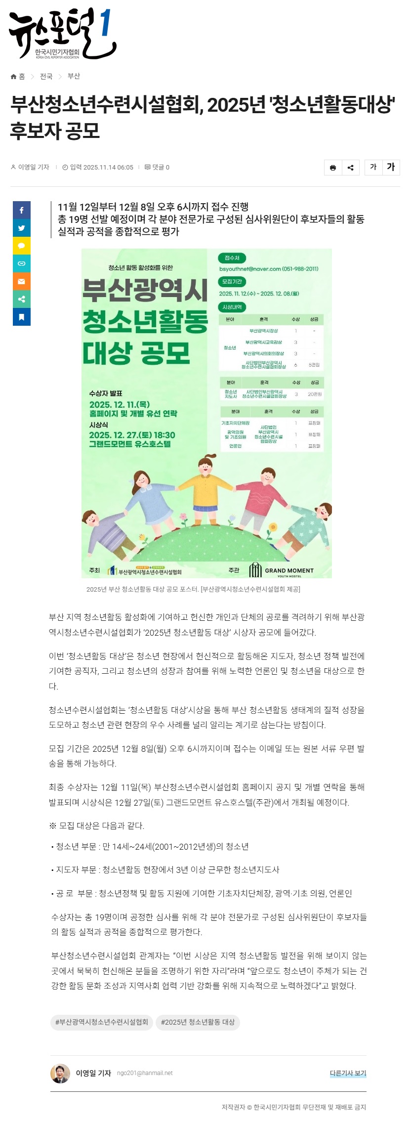 2025년 11월 14일자 [뉴스포털1] 부산청소년수련시설협회, 2025년 '청소년활동대상' 후보자 공모 출처 : https://www.civilreporter.co.kr/news/articleView.html?idxno=530665