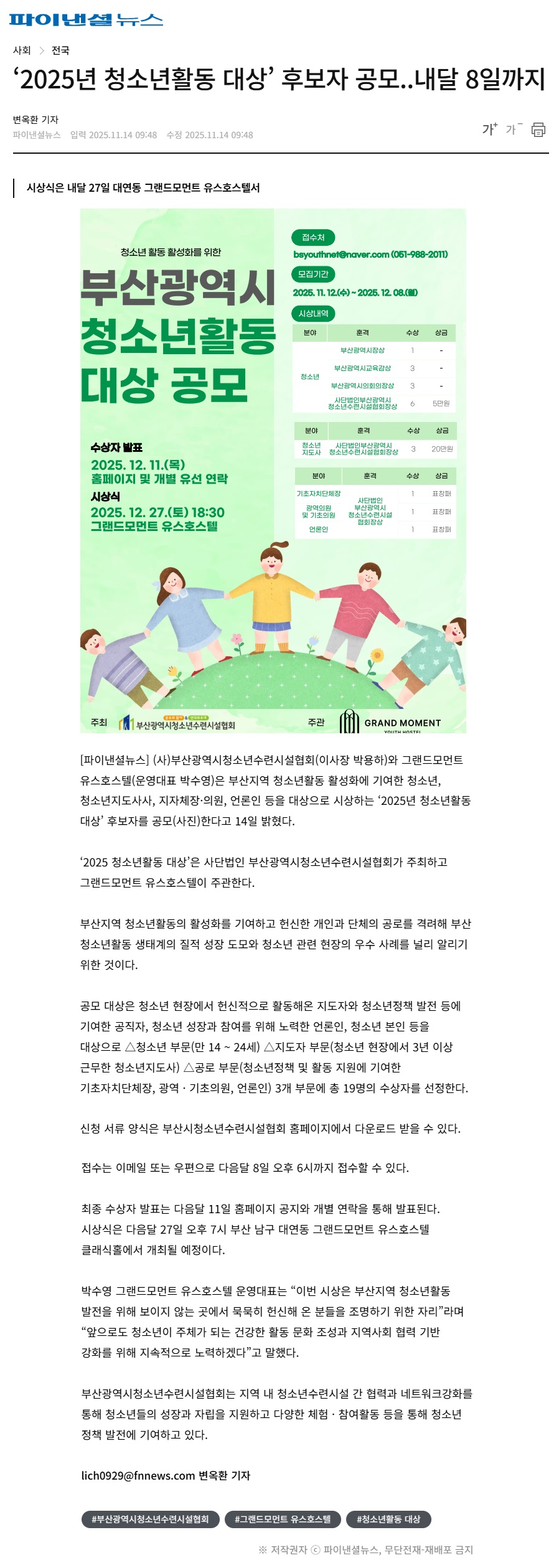 2025년 11월 14일자 [파이낸셜뉴스] ‘2025년 청소년활동 대상’ 후보자 공모..내달 8일까지 출처 : https://www.fnnews.com/news/202511140940591981