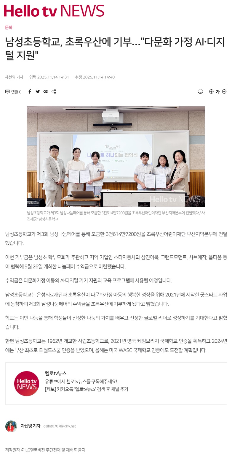 2025년 11월 14일자 [LG헬로비전] 남성초등학교, 초록우산에 기부…다문화 가정 AI·디지털 지원 출처 : https://news.lghellovision.net/news/articleView.html?idxno=526053