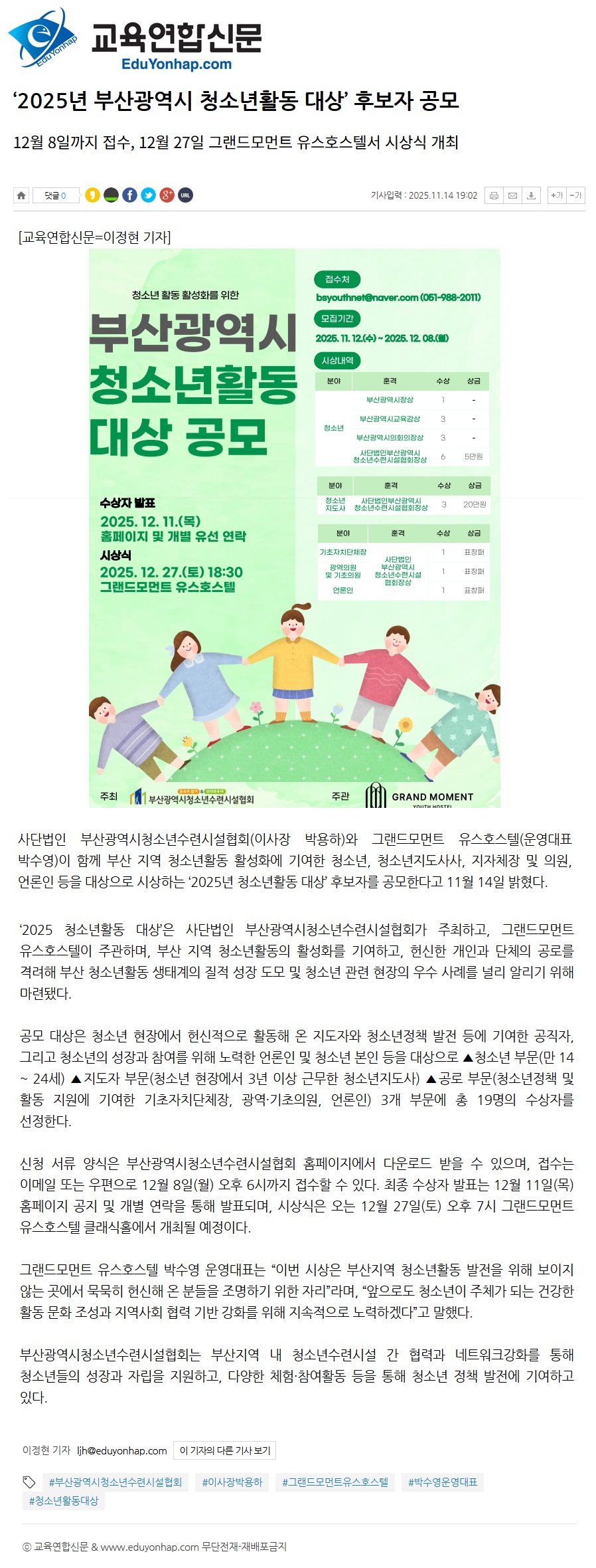 2025년 11월 14일자 [교육연합신문] '2025년 부산광역시 청소년활동 대상' 후보자 공모 출처 : https://www.eduyonhap.com/news/view.php?no=96796