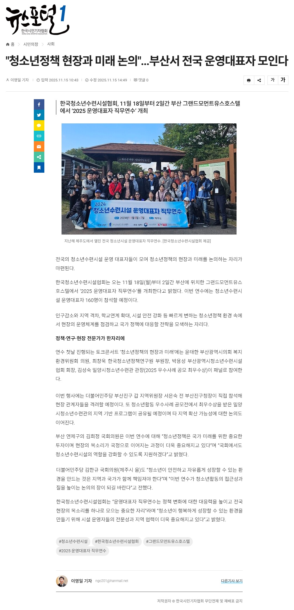 2025년 11월 15일자 [한국시민기자협] 청소년정책 현장과 미래 논의...부산서 전국 운영대표자 모인다 출처 : https://www.civilreporter.co.kr/news/articleView.html?idxno=530715