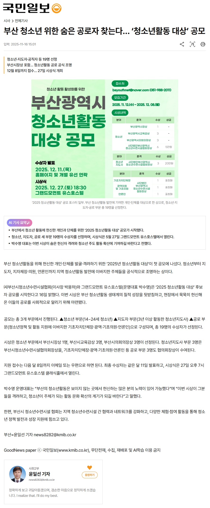 2025년 11월 16일자 [국민일보] 부산 청소년 위한 숨은 공로자 찾는다… ‘청소년활동 대상’ 공모 출처 : https://www.kmib.co.kr/article/view.asp?arcid=0028981092&code=61122019&cp=du