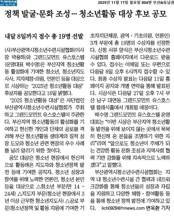 2025년 11월 17일자 [부산파이낸셜뉴스] 정책 발굴 문화 조성…청소년활동 대상 후보 공모 출처 : https://www.fnnews.com/news/202511161836023936